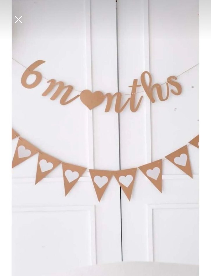 Yarım saat resim çekilmek için kullanıldı yeni şekilde duruyor "6 months" yazılı bej renkli parti süsü, kalp figürü ile birlikte. Hafif malzemeden yapılmış, kolay asılır.