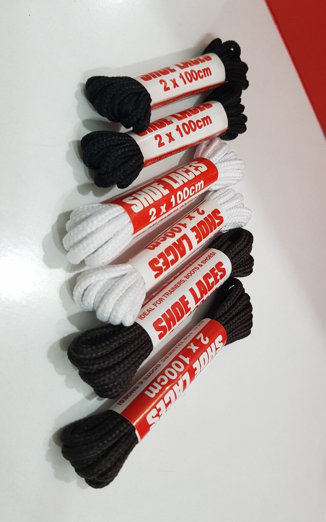 6 çift 100 cm boyunda ayakkabı bağı. spor ayakkabılara ve botlara uyumlu. mumlu, pamuklu kordonlar. 2 x beyaz, 2 x kahverengi, 2 x siyah. ithal ve sıfır ürün.