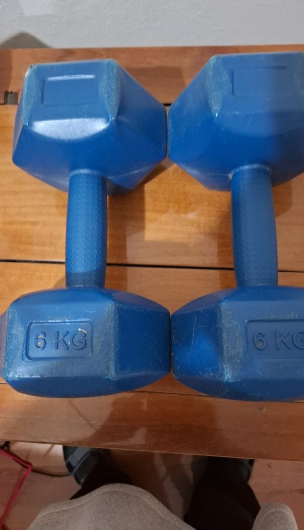 Mavi 6 kg dambıllar, dokulu tutma yüzeyi ile egzersiz için uygundur. Her biri 6 kilogram ağırlığındadır. ️♂️