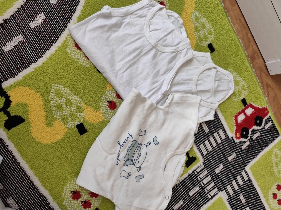 Bebek erkekler için kolsuz, pamuklu beyaz bodyler, yuvarlak yaka ve sade tasarım. Birinde sevimli ayıcık baskısı bulunur.