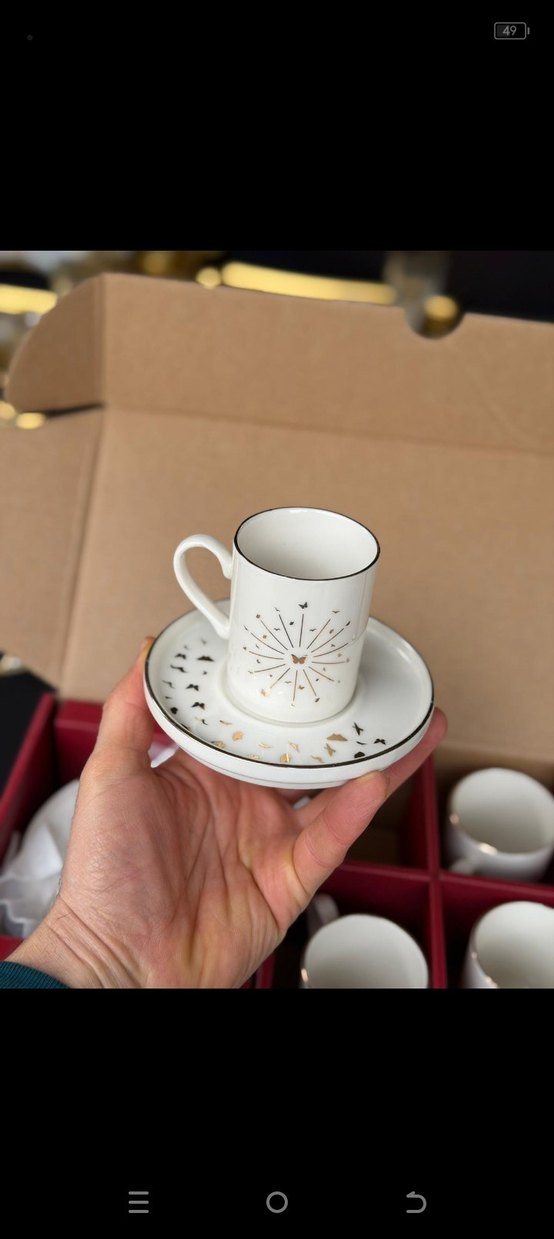 Beyaz kahve fincanı ve tabağı, ince altın ve siyah desenlerle süslenmiş, ince kenar detayına sahip. 6 Kişilik Altın yaldızlı porselen lüks kahve tk Ptt kargo Mng kargo