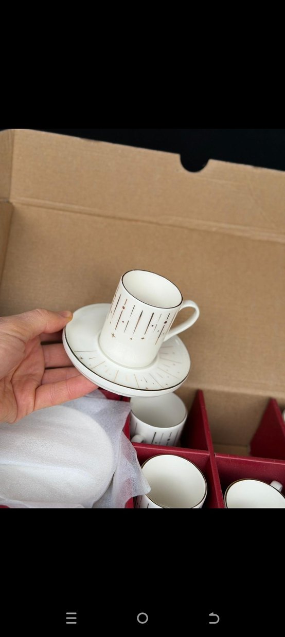 Beyaz fincan ve tabak seti, ince altın çizgi desenleriyle zarif ve hafif bir tasarıma sahiptir. Kahve veya çay sunumu için uygundur. ☕ 6 Kişilik Altın yaldızlı porselen lüks kahve tk ptt kargo MNG kargo