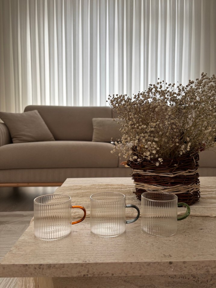 Yeşil, turuncu ve mavi saplı üç şeffaf cam fincan seti. Her fincan yuvarlak ve pürüzsüz yüzeye sahip. ☕