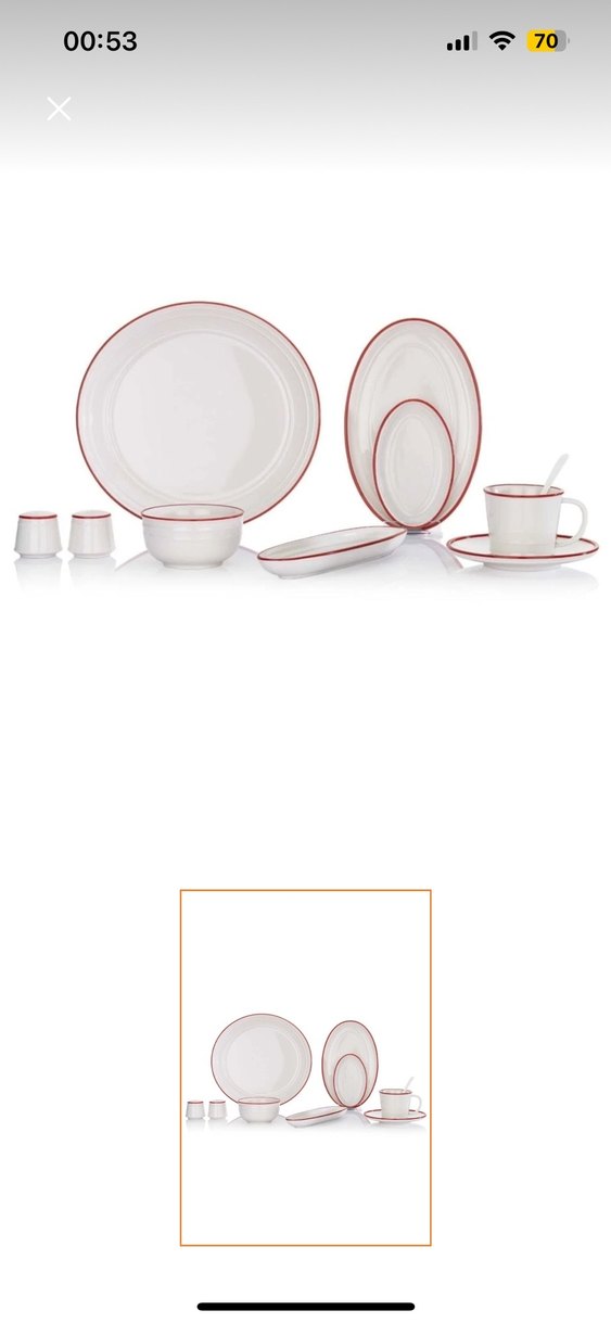 Beyaz üzerine kırmızı ince çizgili tabak, kase, fincan ve tabağı içeren kahvaltı takımı. ️6 kişiliktir. Ürün sıfırı 5000 tl model değiştirmek için satıyorum isteyene daha detaylı fotoğraf atarım