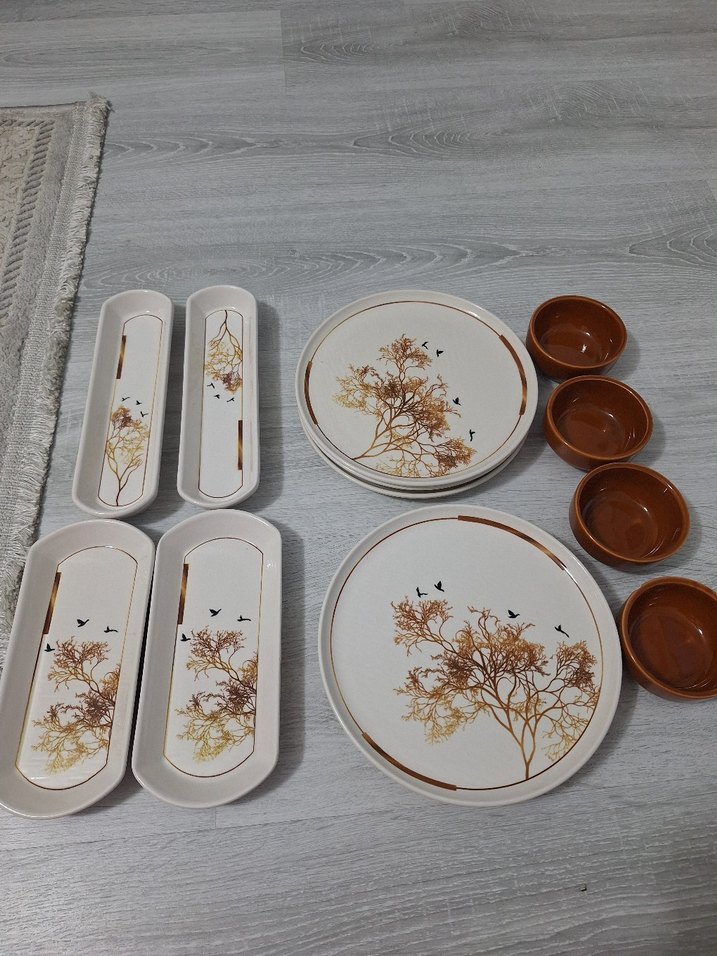 Kahverengi, doğal ağaç ve kuş desenli tabak, tepsi ve küçük kaselerden oluşan servis takımı. 14 parçadan oluşuyor.