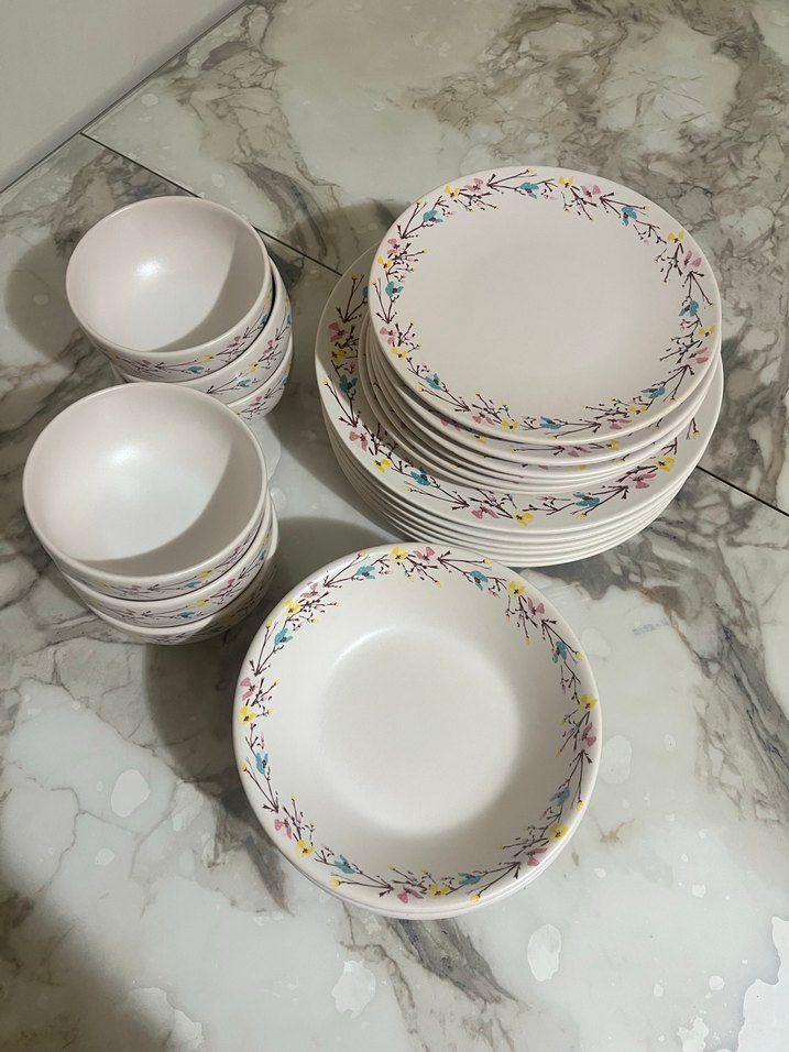 Çiçek desenli beyaz yemek takımı, farklı boyutlarda tabak ve kaselerden oluşur. 24 parçadır.