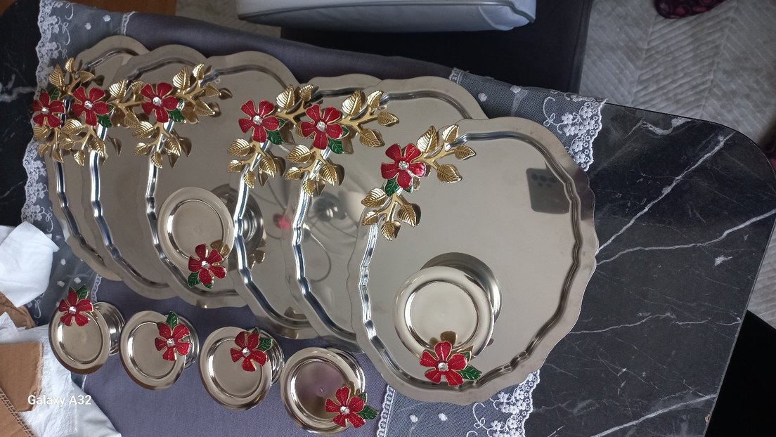 6.lı Parlak altın renkli çiçek, desenli çelik parlak tepsi ve sunumluk. Kırmızı ve altın renkli çiçek detaylarıyla geleneksel kahve sunumlarına şıklık katıyor.hiç kullanılmadı sıfırdır.