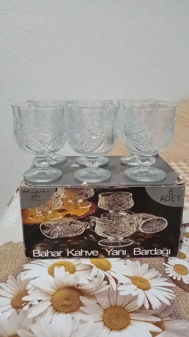 Altı adet çiçek desenli, kısa saplı ve sağlam tabanlı şeffaf cam kahve yanı bardak seti. ☕