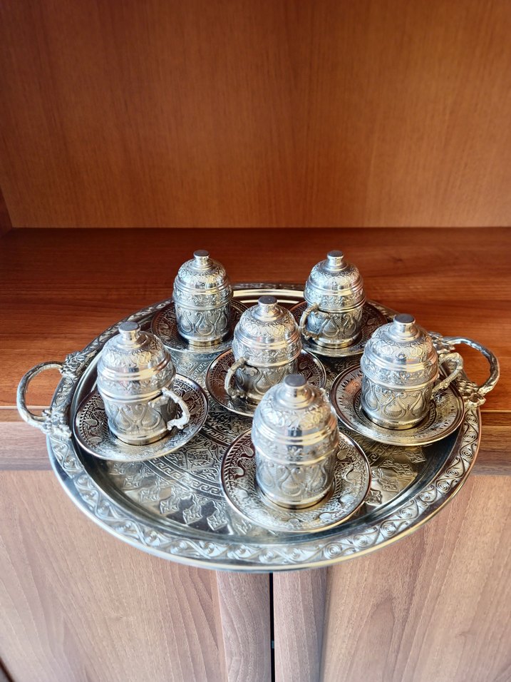 KAHRAMANMARAŞ İŞİ, MAKİNEDE İMAL EDİLMİŞ, EL İŞLEMESİ OLMAYAN TAMAMEN BAKIR .. 6 ADET FİNCAN 6 ADET FİNCAN KAPAĞI 6 ADET FİNCAN TABAĞI 1 ADET TEPSİDEN OLUŞMAKTADIR.
