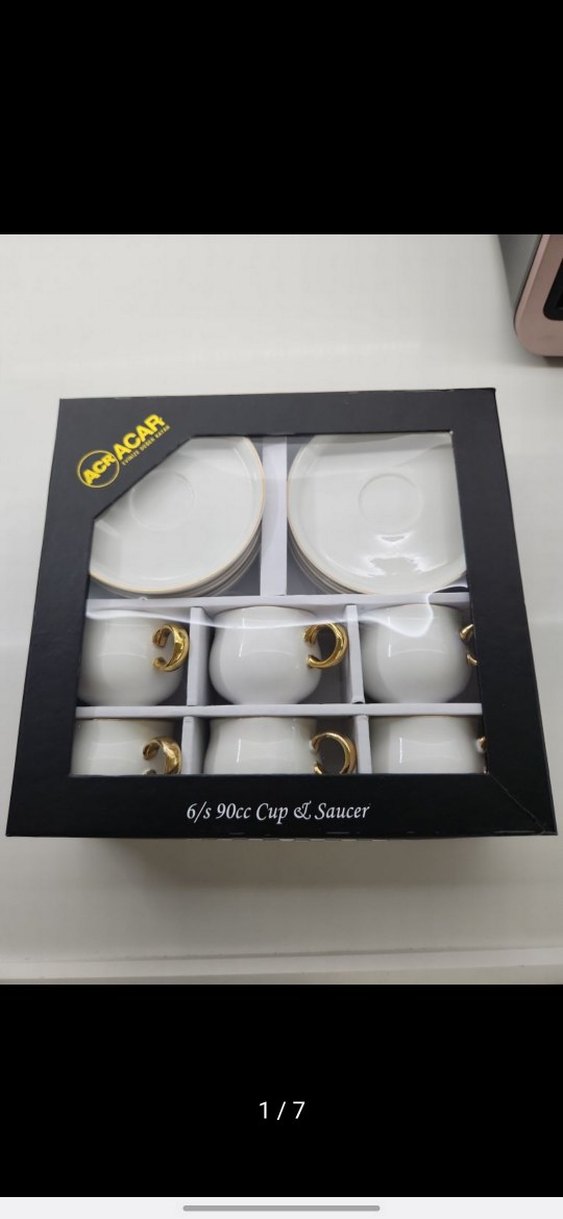 Altın renkli kulplara sahip, her biri 90cc kapasiteli 6 beyaz fincan ve tabaktan oluşan set. az kullanıldı tertemiz kutusu dahi duruyor modasi geçmeyecek sade şık bir takım. porselen dir. yeni alacağım için satıyorum.