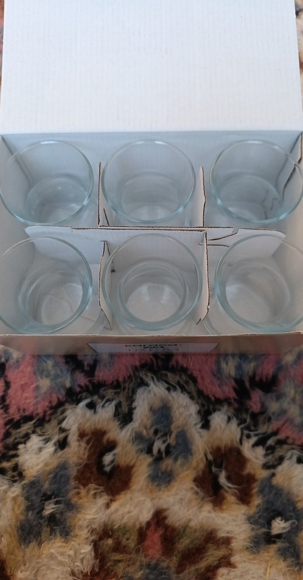 Bej kutuda altı adet şeffaf cam bardak seti. Günlük kullanıma uygun, sade ve şeffaf tasarım.