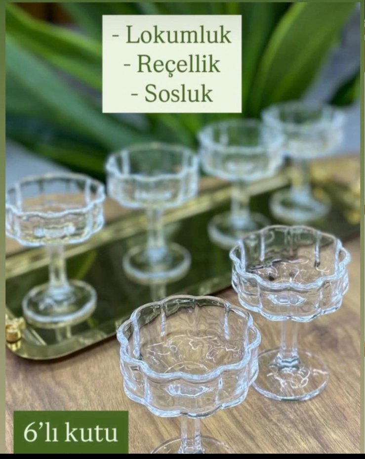 6'lı cam lokumluk, reçellik ve sosluk seti. Her biri dekoratif kenarlara ve ayaklı tasarıma sahip. çok büyük birşey beklemeyin kahve Yanı sunumluk için çok ideal