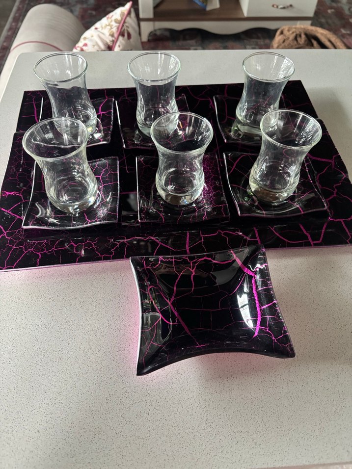 Altı adet bardak ve mor desenli tabaklardan oluşan koyu renkli çay seti. Takım tepsi ve şekerliğide içindedir . Toplamda 8 parçadır