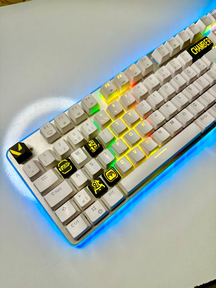 Renkli arka aydınlatmalı, özel tuş kapaklı beyaz mekanik klavye, aydınlatmalı tabanıyla canlı bir görünüm sunar.