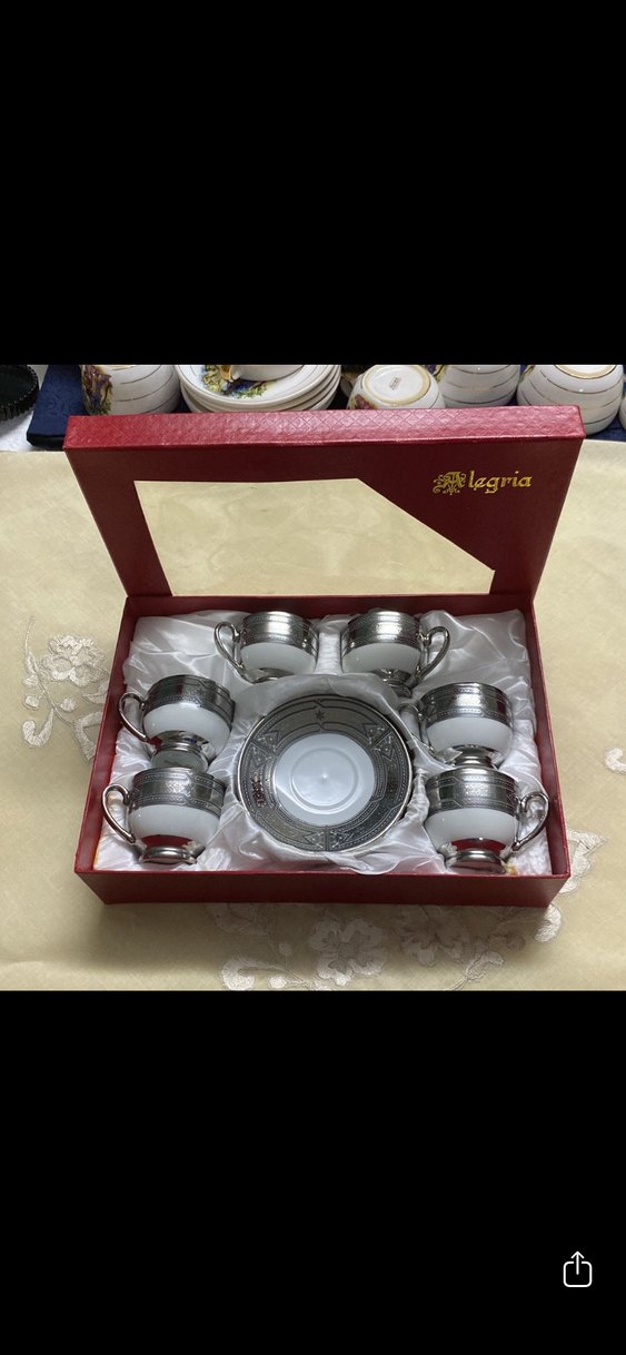 Kulp ve gri detaylara sahip beyaz 6 fincan, uyumlu tabaklarıyla kırmızı kutuda sunuluyor. Marka adı 'Legria' kutuda yer alıyor. Kutusuyla beraber gönderilecektir. Kullanılmamıştır ancak tabak ve fincanlarda fabrikasyon defoları mevcuttur.