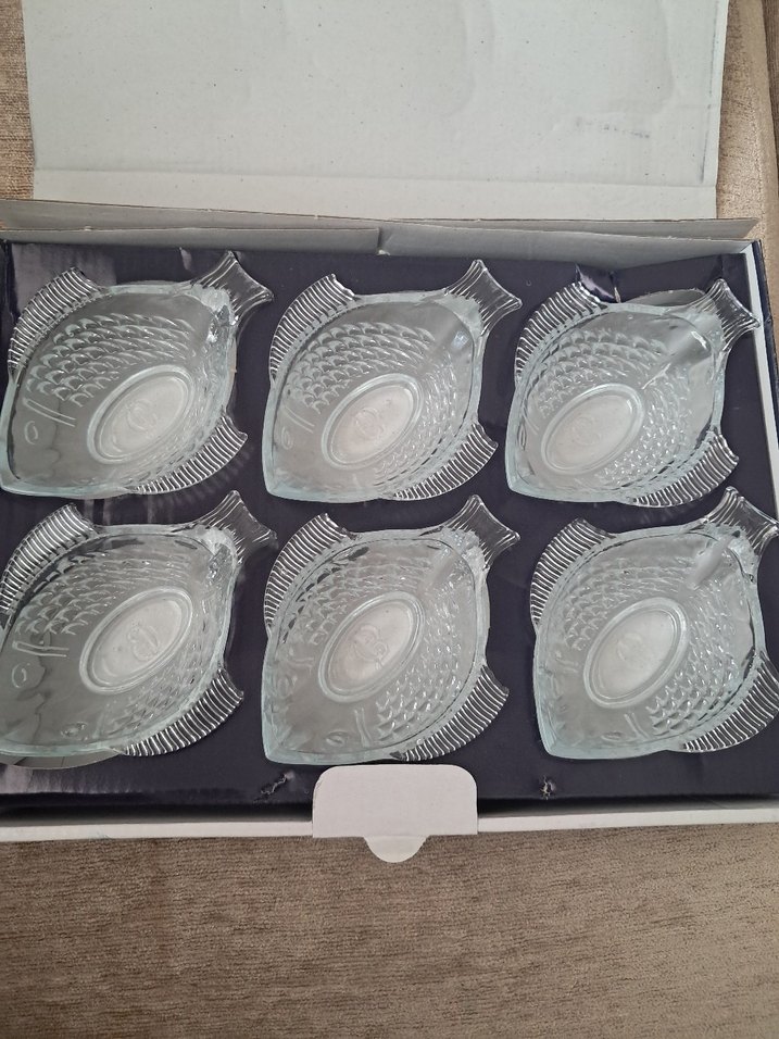 6 adet balık şeklinde, gri renkte ve desen içermeyen cam tabak seti. Atıştırmalıklar için uygundur.