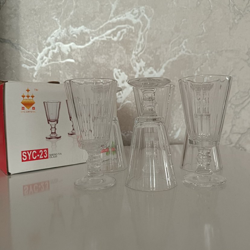 Ayaklı ve dikey çizgili desenli şeffaf cam bardak seti, içecek sunumunda sade ve şık bir görünüm sağlar.