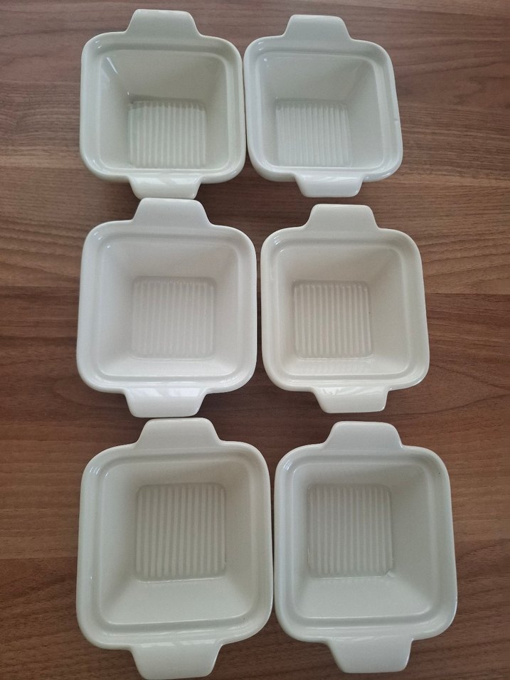 Altı adet kulplu, beyaz kare yemek kabı seti. İç kısmı çizgili tabanlıdır, yiyecek saklama ve servis için uygundur. ️bazılarında minik atıklar var alt taraflarında resmettim