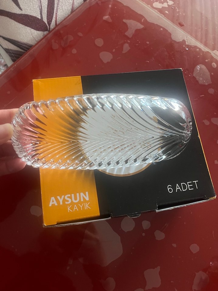 Aysun markasına ait, desenli, cam renkli 6 adet kayık şeklinde tabak seti.ister kahvesunumluk ister kahvaltılık sosluk her şey konur sıfır paketli ürün