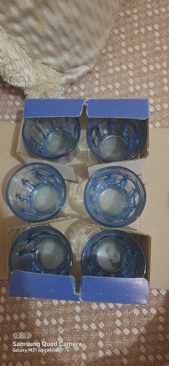6 adet koyu mavi renkte, yuvarlak tasarımlı cam bardak seti. Günlük kullanım için uygundur. kahve yanı için ufak boyuttadir