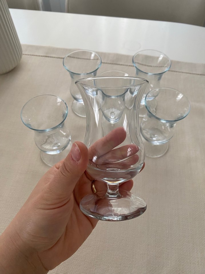 Altı adet küçük ayaklı, hafifçe genişleyen şeffaf cam bardak seti.