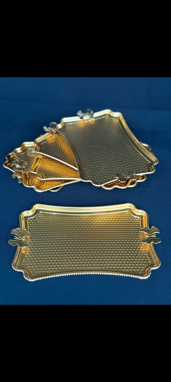 Parlak altın renkli, şık kulplu dekoratif tepsi seti. Mutfakta servis veya sunum için uygundur. ✨