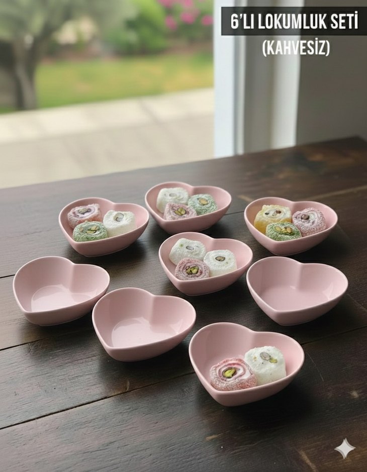 Pastel pembe renkte, kalp şeklinde 6 adet lokumluk seti. Kahvesiz lokum sunumu için uygundur.