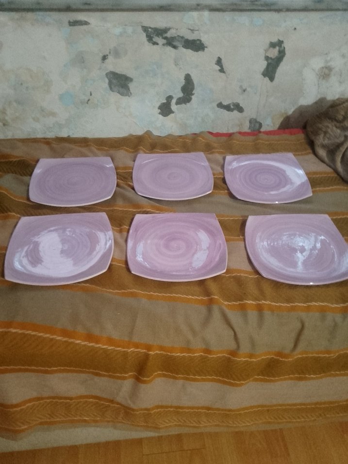 Altı adet açık pembe, spiral desenli seramik tabak seti. Kare ve yuvarlatılmış kenarlarıyla sunum için uygundur. ️