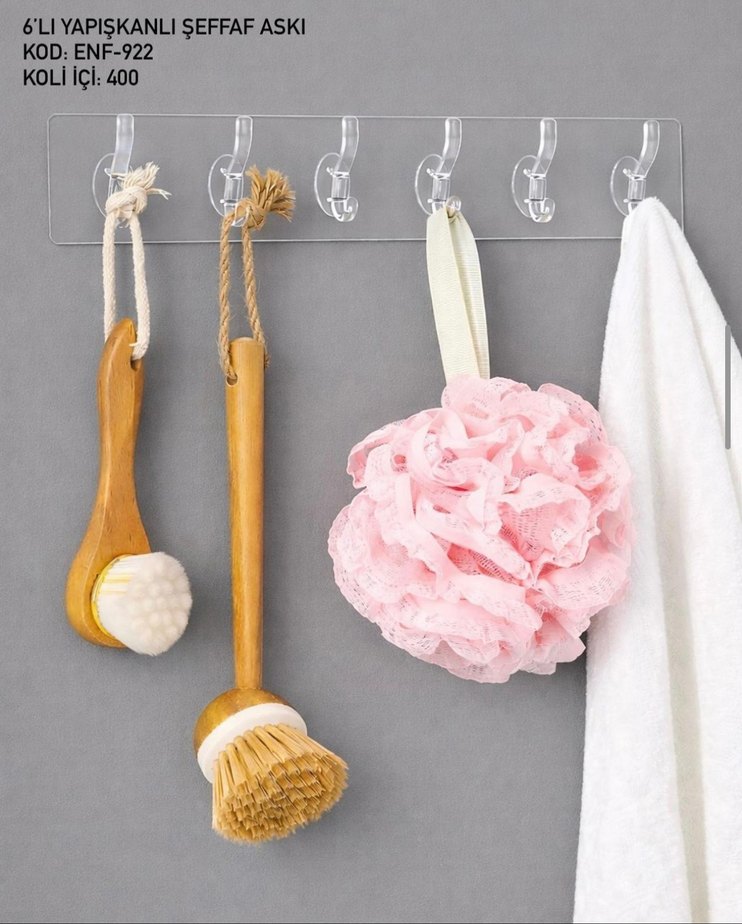 6 kancalı, şeffaf yapışkanlı askı. Banyo aksesuarlarını asmak için uygundur ve kolayca yapışır.