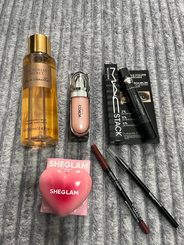 Çeşitli makyaj ürünlerinin olduğu setimiz Victoria secret vücut spreyi kiko 04 gloss mac maskara sheglam allık kiko 04 dudak kalemi maybelline göz kalemi