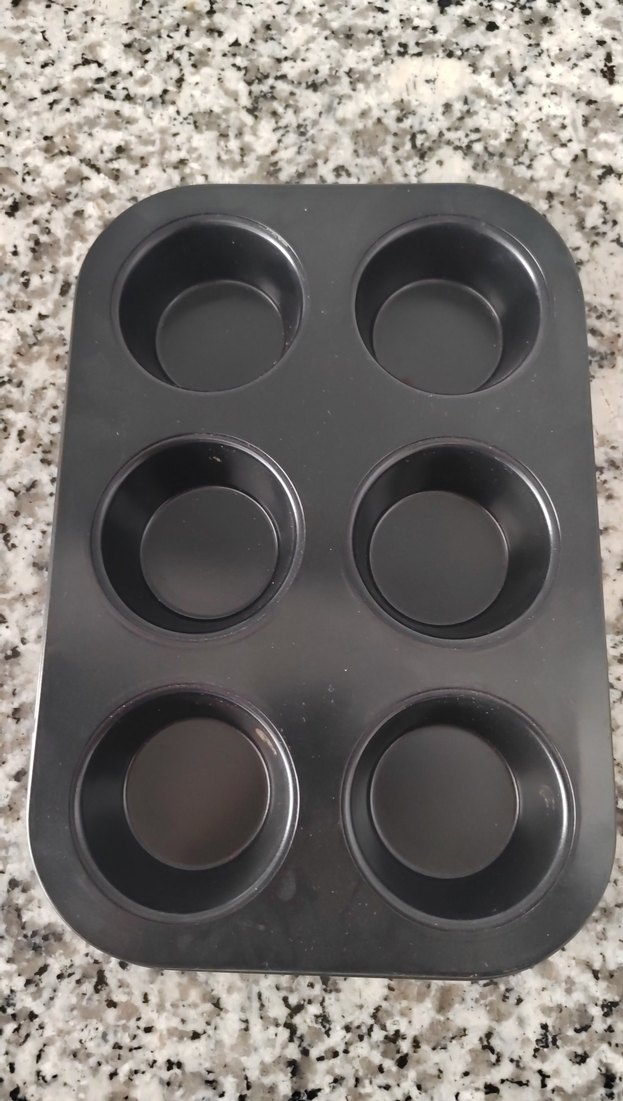 Altı yuvarlak bölmeli siyah muffin kalıbı, yapışmaz yüzeyi ile kolay pişirme ve temizlik sağlar.