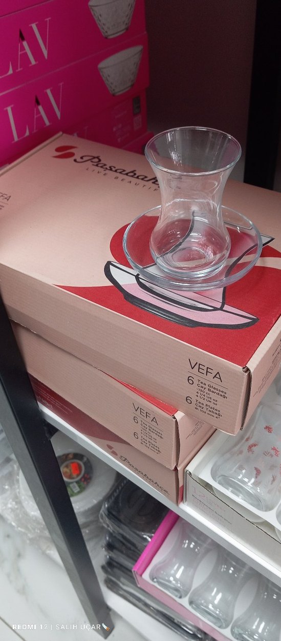 Vefa markasının 6'lı çay bardağı ve tabağı seti, şeffaf camdan yapılmıştır ve kırmızı-bej kutuda sunulmaktadır.