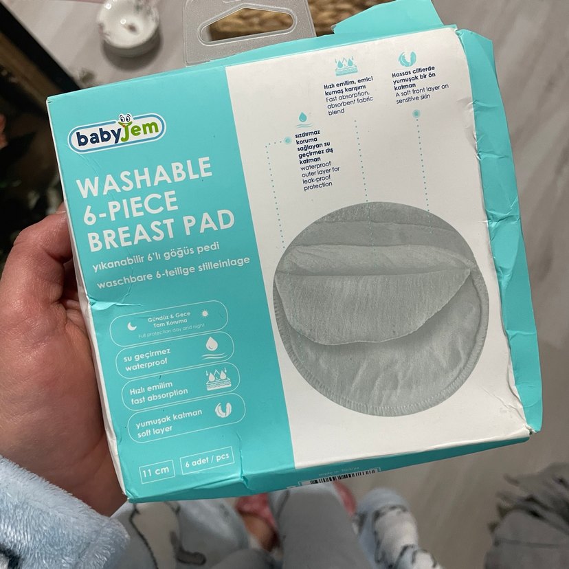 BabyJem yıkanabilir 6'lı göğüs pedleri, su geçirmez koruma, hızlı emilim ve hassas cilt için yumuşak katman sunar. Her ped 11 cm çapındadır.