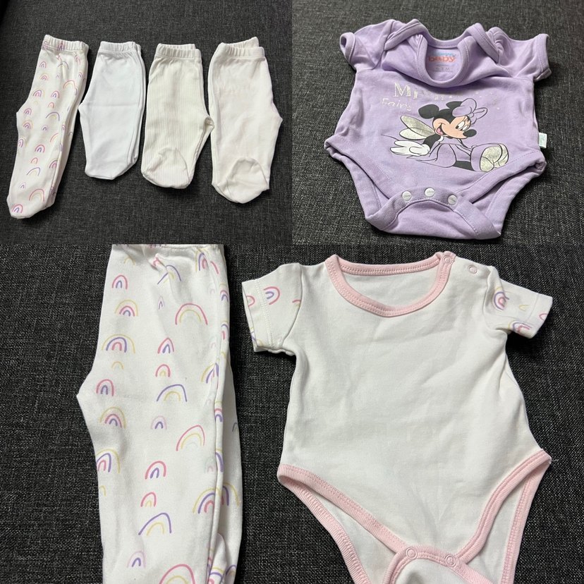 Bebek kız için pastel renklerde Minnie Mouse baskılı mor body, beyaz kısa kollu pembe detaylı body ve 4 adet beyaz ayaklı pantolon seti.
