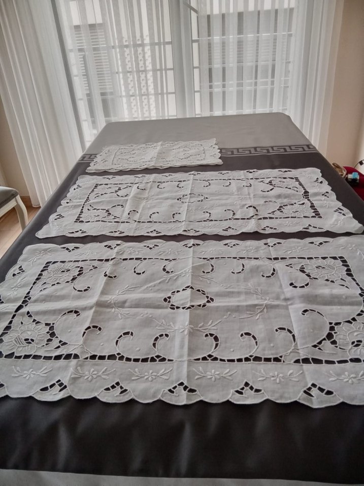 Takım 2 büyük 4 küçük parçadan oluşmaktadır. Büyük olanların eni 74 cm boyu ise 38 cm. Küçük olanların eni 42 cm, boyu ise 26 cm. Ürünler hiç kullanılmamıştır.