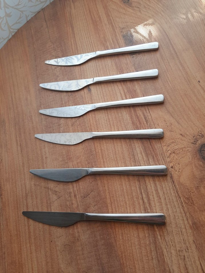6 parça paslanmaz çelik bıçak seti, sade tasarıma sahip. Her bıçakta düz sap ve keskin ağız bulunur.