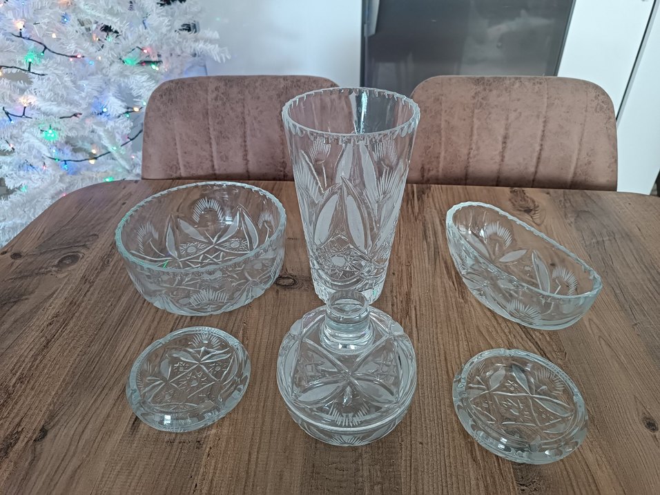 Kesme desenli şeffaf cam vazo takımı zarif ve detaylı tasarımıyla dikkat çekiyor. Sağlam tabanı ve uzun yapısıyla şıklık katıyor. az kullanılmış kırık çatlak çizik yoktur temiz
