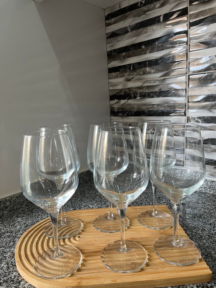 Uzun saplı, şeffaf 6 parça şarap kadehi seti, ahşap tepsi üzerinde yer almaktadır.