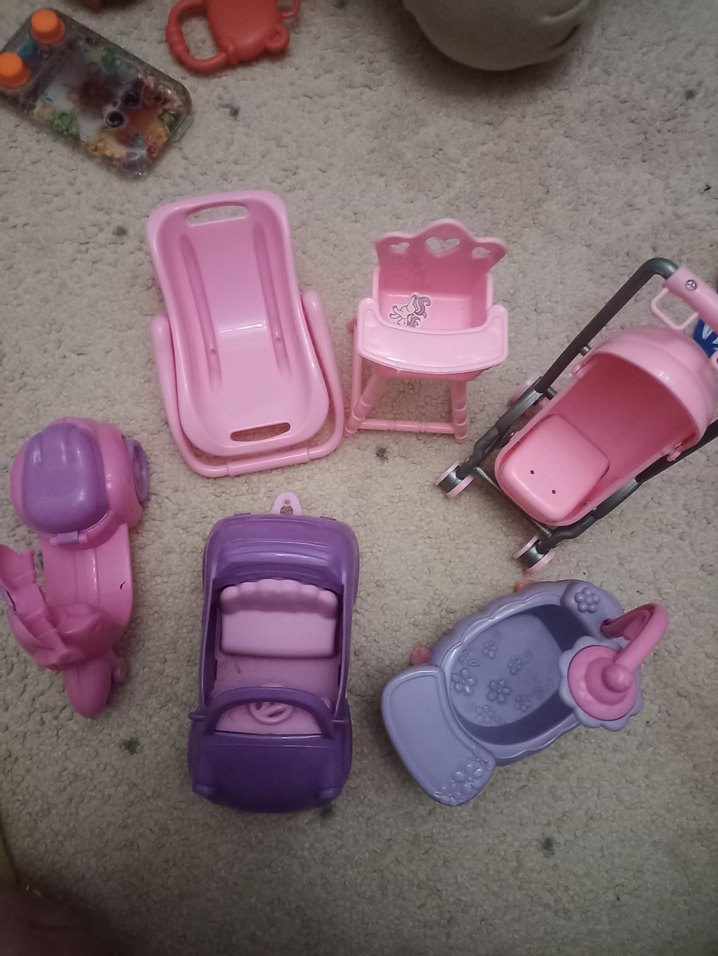 Pembe pastel tonlarında oyuncak bebek arabası, mama sandalyesi, araba koltuğu ve diğer bebek aksesuarlarından oluşan set. Hayal gücünü destekler. bebek dahil değil.boyut anlaşılsın diye koydum.chelsea ve daha küçük bebeklere uygundur.