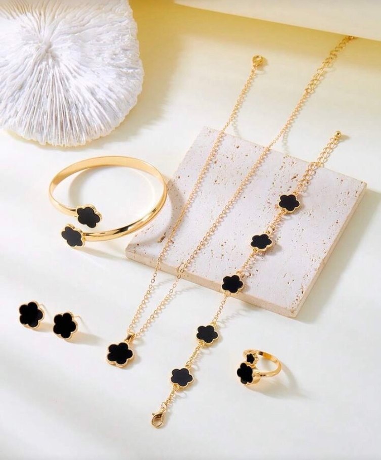 Altın rengi ve siyah çiçekli boncuk detaylı bileklik, kolye, küpe ve yüzük içeren minimalist kadın takı seti, günlük kullanım için uygundur.