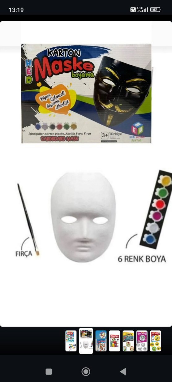 6 renk boya ve fırça içeren, boyanabilir karton maske seti. 3 yaş ve üzeri için uygundur.