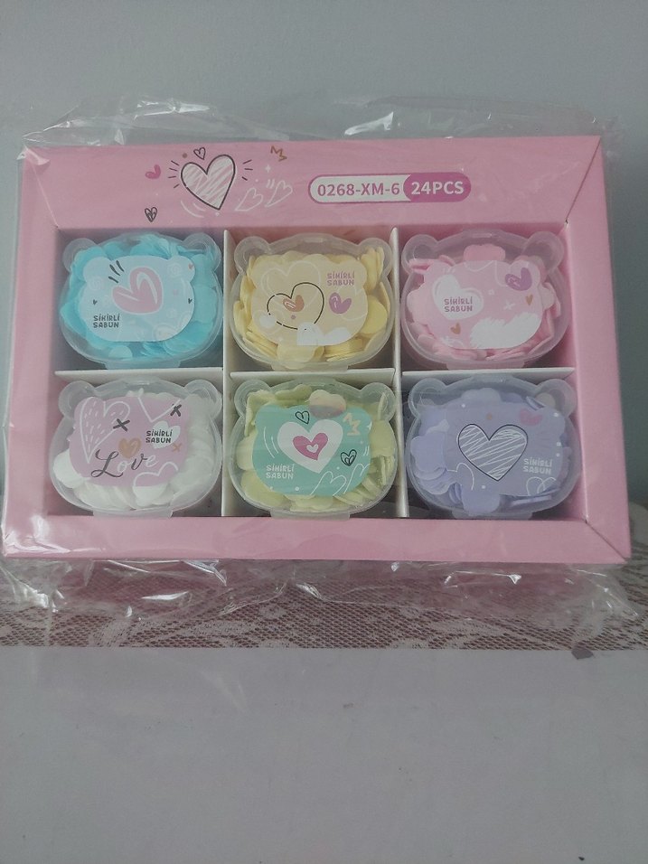 Pastel renklerde, kalp figürlü 24 Sabun pembe kutuda paketlenmiştir. Her sabun farklı renkte ve sevimli kalp desenlidir. Herkesin yanında rahatlıkla taşıyabileceği küçük kalıplar halinde kutulu el sabunu,mavi,sarı,pembe,beyaz,mor ve yeşil gibi renk seçenekleri mevcuttur. Daha az sayıda isterseniz de gönderilebilir.