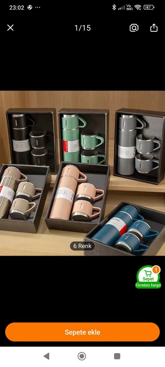 6 farklı renkte termos ve iki kupa seti, hediye kutusunda, ücretsiz kargo ile sunulmaktadır. ☕