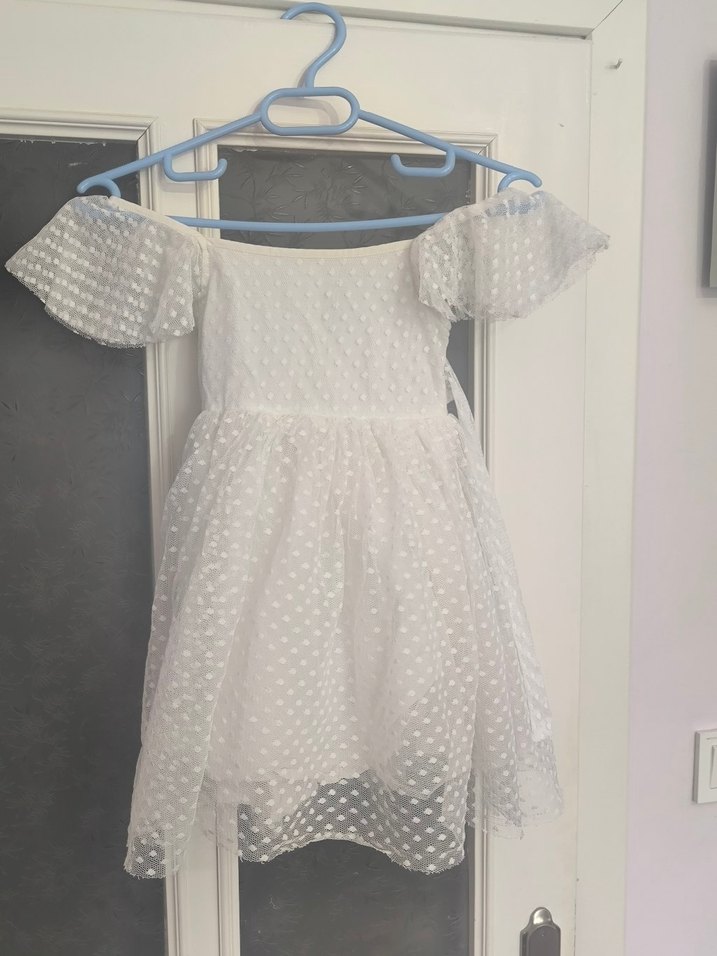 6 yaş Pamuklu kumaştan yapılmış, fırfırlı ve straplez kol detaylı, bol kesimli hafif beyaz kız çocuk elbisesi. Bohem tarzını yansıtır.