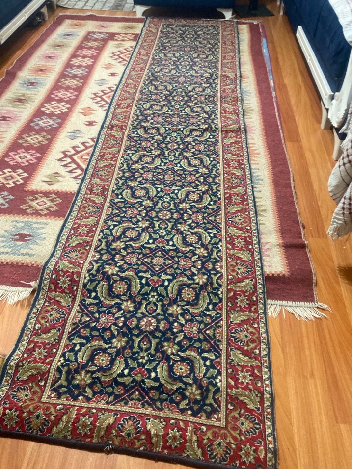 Ölçüler • En: ~61 cm • Boy: ~275 cm ➡️ Uzun yolluk formu (dar–uzun Dokuma & Malzeme • El dokuma • Hav: Yün (görüntüde sentetik parlaklık yok) • Çözgü: Büyük ihtimalle pamuk • İlme sıklığı: Orta–iyi (sık ama saray halısı kadar ince değil Kondisyon (Önemli) Artıları: • Desenler net • Renkler canlı (özellikle lacivert iyi korunmuş) • Genel form düzgün Eksileri: • Uçlarda hafif dalgalanma • Kenarlarda çok hafif aşınma • Püsküller kısmen yıpranmış olabilir (fotoğrafa göre)