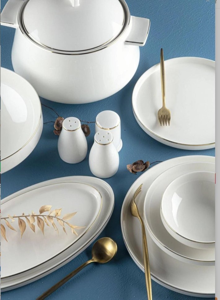 Marella Porselen Modern 60 Parça Bone Gold Yemek Takımı 12 Adet Servis Tabak 12 Adet Pasta Tabak 12 Adet Yemek Tabak 12 Adet Kase 3 Adet Küçük Kayık 1 Adet Büyük Kayık 1 Adet Çorbalık 1 Adet Çorbalık Kapağı 2 Adet Tuzluk 2 Adet Biberlik 2 Adet Kürdanlık