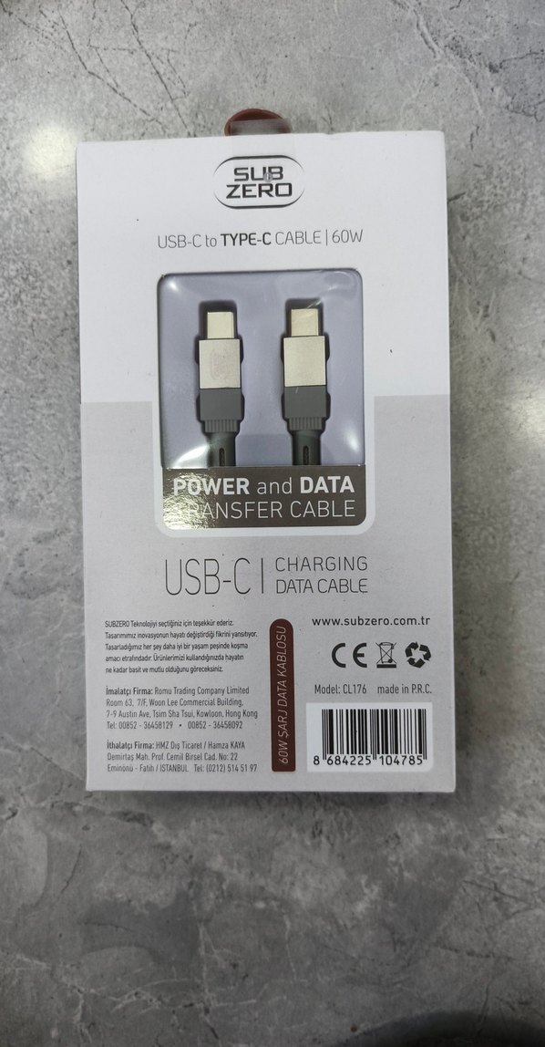 SUB ZERO markalı gri USB-C to USB-C kablo, 60W güç ve veri transferi sağlar. Hızlı şarj ve veri aktarımı için uygundur. ⚡