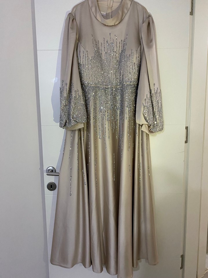 Ölçüleri sorabilirsiniz 1 kere kullanıldı 4 saat giydim kurutemizleme yapıldı tertemiz GENÇ BÜYÜK BEDENLER KAÇIRMAYIN (isteyene şalı ile birlikte gönderebilirim +500 tl 3 metre şalı var uzun )Bej renkli, işlemeli, uzun kollu ve bol kesim abiye elbise. Drapeli yakası ve parlak detaylarıyla düğünler için uygundur.