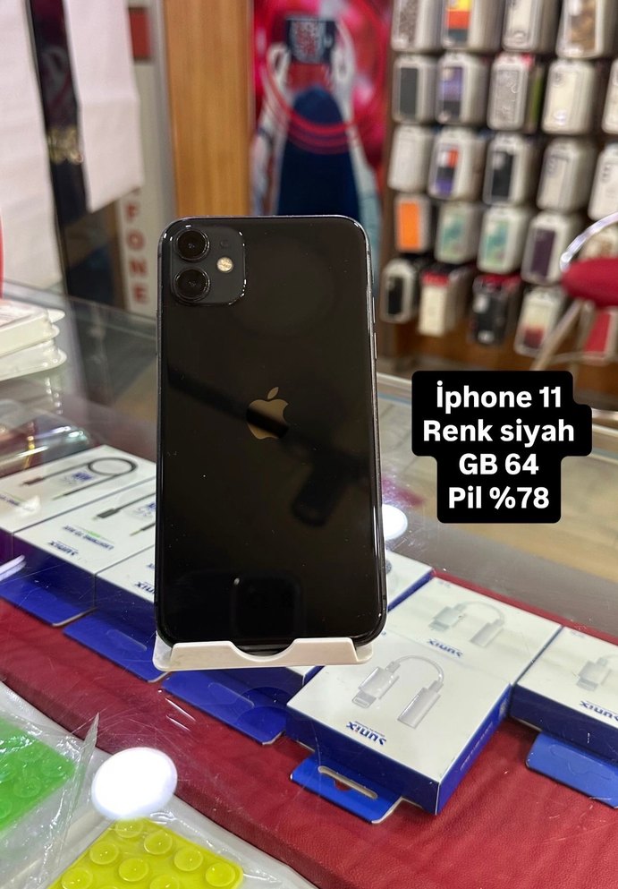 64 GB depolama alanına ve %78 pil kapasitesine sahip siyah iPhone 11. Çift arka kamera ve şık tasarım içerir.