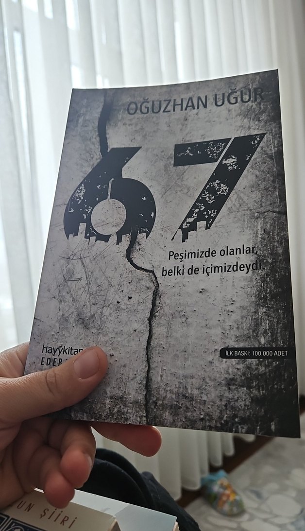 Oğuzhan Uğur'un "67" adlı romanı, "Peşimizde olanlar belki de içimizdeydi" alt başlığıyla dikkat çekiyor. Hayykitap ve EDEF tarafından yayımlandı, ilk baskısı 100.000 adet.